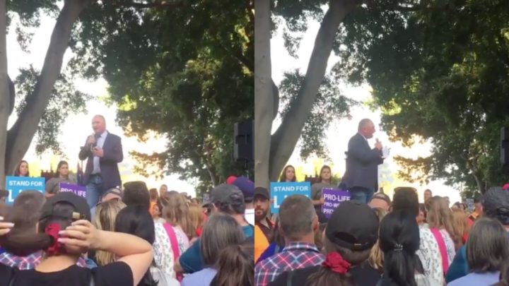 With signs reading “pro-life” and “stand for life” surrounding him Joyce yelled out: “There is not one person here who was not born… there comes a time when there are two people, and two people have rights, and those rights must be respected otherwise society is destroyed.