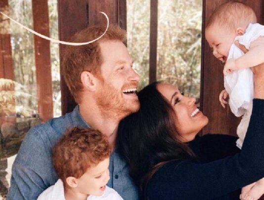 On Harry’s right knee, sits a lopsided Archie, now a young boy. Archie’s little blue jeans are cuffed, and his white button-down is adorable. He slips off Harry’s leg, as he glances, laughing toward Meghan and Lili. Strikingly, Archie’s hair is a deep fiery red, the same colour as Harry’s.