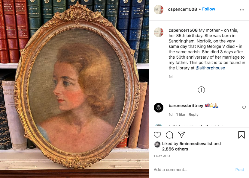 “My mother – on this, her 85th birthday,” he wrote alongside the image. “She was born in Sandringham, Norfolk, on the very same day that King George V died – in the same parish. She died three days after the 50th anniversary of her marriage to my father. This portrait is to be found in the library at @althorphouse.”