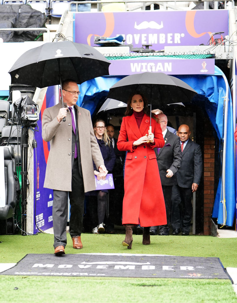 Braving the rain, Catherine proved she’s an absolute style icon as she cheered on team England at the Rugby League World Cup Quarterfinals as they played against Papa New Guinea’s national team at the DW Stadium in Wigan, England on Saturday, November 5.