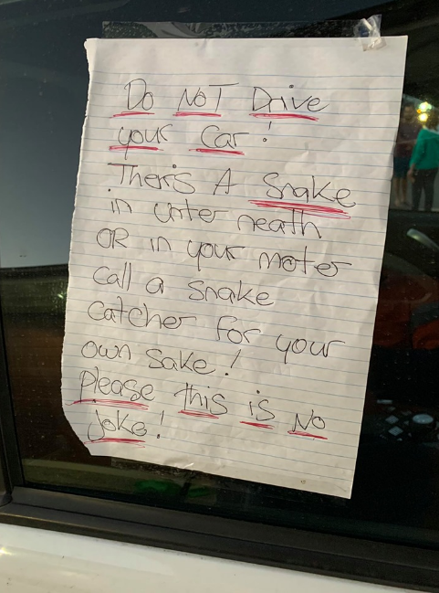 Taking to Facebook to share the discovery Bryce posted a photo of the snake happily taking a nap without any care in the world of the shock it had caused. “A very concerned passerby left this note on this car and the owners decided not to risk it and got us out and turns out it was no joke,” he wrote alongside the photo.