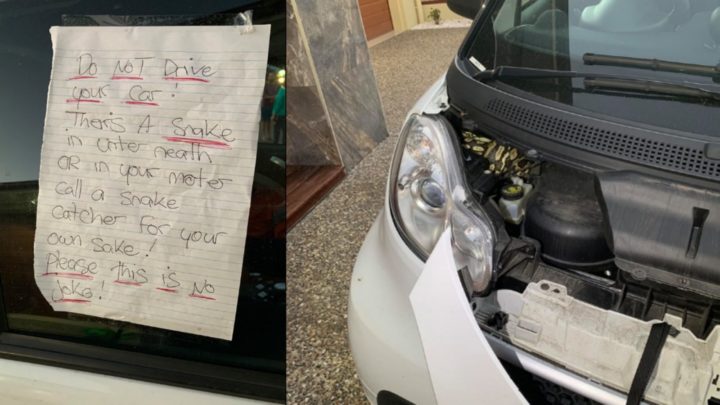 While finding a note stuck to your car is usually a cause for concern, one Queensland family have their neighbours to thank this week after they warned them that a brazen snake had taken up residence in their parked car. The Logan family returned home to find the scrap of paper attached to their vehicle, notifying them of the slippery serpent’s movements.