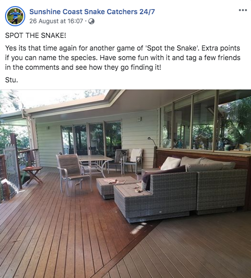 In the post, snake catcher Stu uploaded a snap of the decking area, showing a comfy looking couch and dining table and asked fans to guess where the sneaky snake was hiding. “Yes it’s that time again for another game of ‘Spot the Snake’,” he wrote alongside the image. “Extra points if you can name the species. Have some fun with it and tag a few friends in the comments and see how they go finding it!”