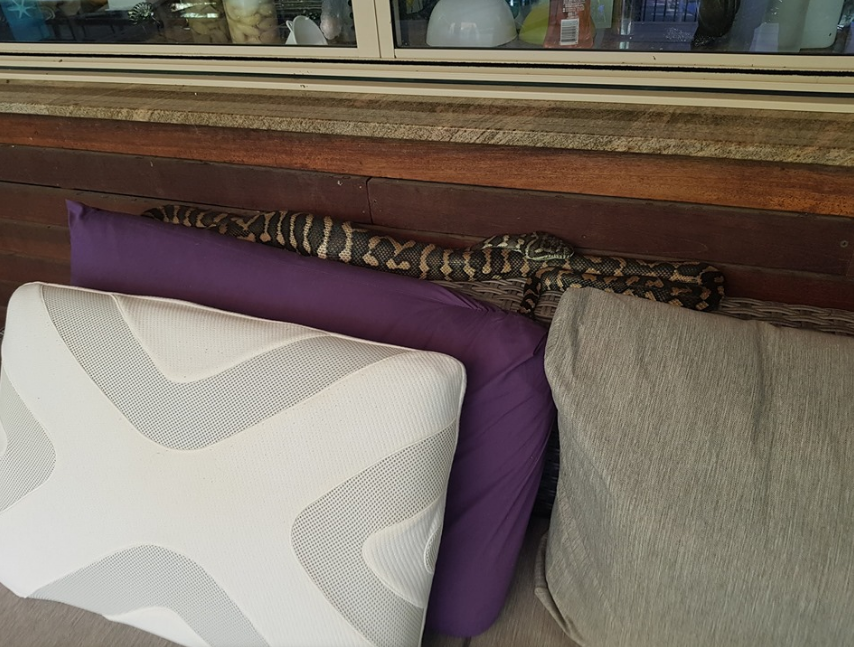 In a follow-up post, Stu gave a bit more detail and a close-up image to show the snake’s very well-hidden location. It may take a bit of squinting, but the reptile is actually lying behind the couch with a small part of its body seen behind the cushions. “Coastal Carpet Python on the back of the sun lounge,” the snake catcher wrote on the post. “Congrats to all those who got it correct!”