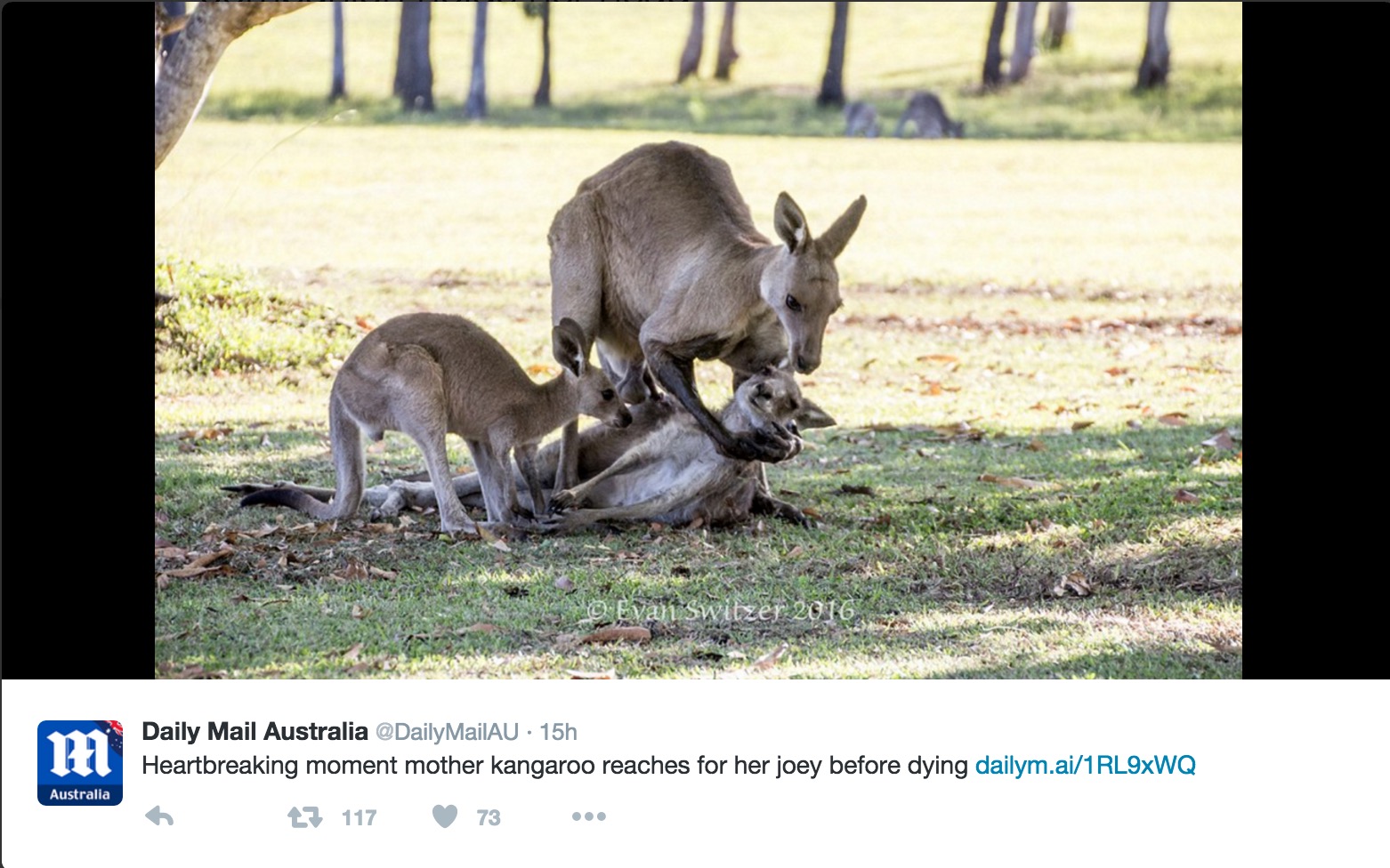 Fraser Coast photographer Evan Switzer captured a moment of grief as a kangaroo holds his dead mate. http://ow.ly/WYlRo