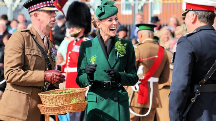 This year marked Catherine’s return as Colonel of the Irish Guards, and the focus quickly turned to the details. She wore a deep green Alexander McQueen coat dress, a designer she consistently returns to for military and ceremonial engagements, paired with a structured hat and the gold shamrock brooch traditionally worn for the parade. The brooch itself dates back to the early 20th century and has been worn by royal women attending the event for decades, including the Queen Mother.