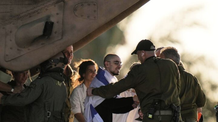 Beaming with relief and joy, two released hostages waved to cheering crowds from vans on the way to an Israeli hospital, one hoisting a large Israeli flag then forming a heart with his hands.