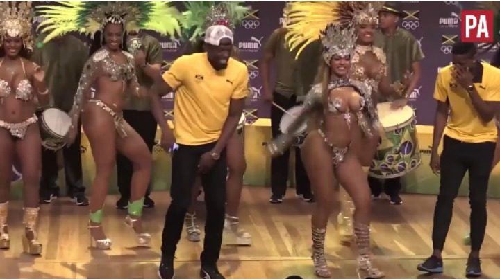 In Rio for the Olympic Games, the 100m and 200m world record holder made an unforgettable exit from his press conference, dancing his way off the stage with a bevy of Brazilian beauties.