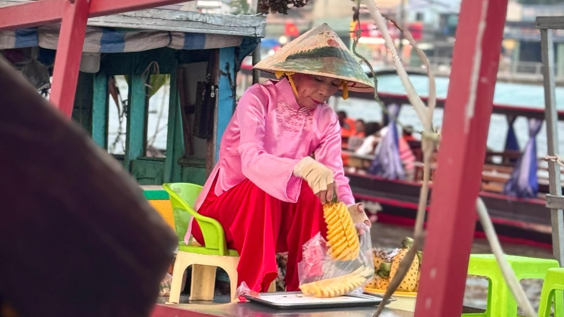 From every direction, other vessels appeared, converging with quiet urgency to trade. Floating vendors pulled alongside offering steaming bowls of beef pho assembled in front of us for around AUD $1.80. There is a haste to the exchange; the vendor waits patiently while you finish and return the bowl. Another boat arrives with Vietnamese iced coffee. Another with whole pineapples, carved into neat spears right before your eyes.