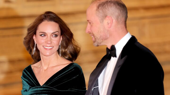 Kate, radiant in her first public appearance since announcing her remission, turned heads in an elegant emerald green velvet gown by Talbot Runhof. Paired with dramatic Greville diamond chandelier earrings once owned by Queen Elizabeth, her look combined classic royal glamour with a deeply personal touch. Prince William looked equally sharp in a velvet-trimmed black tuxedo and bow tie, making it a picture-perfect royal date night.