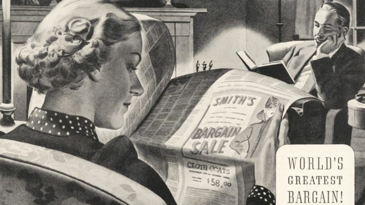 World's greatest bargain! A vintage illustration of a wife reading the sales advertisements in a newspaper in 1937. Source: GraphicaArtis/Getty Images