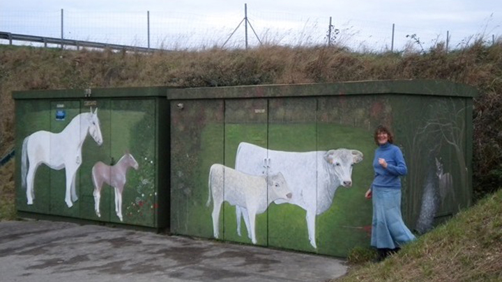 Knowing I am an artist, in 2009, the mayor of the French village where I live as an English ex-pat asked me to paint a mural on the housings of the two concrete electricity relay stations, each 4 metres by 2.35 wide and 2.19 high. They were on the outskirts of the village next to the wind turbines and had been covered in graffiti and the mayor thought that if they sported murals they wouldn’t be ‘tagged’ anymore. The electricity company, EDF, had said they would pay for the paint.