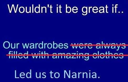 This one about Narnia is so apt; I’ve traveled the universe in my mind thanks to wonderful writers in many genres. I totally forget my surroundings and block out what is happening everywhere other than in the book. Yes, I’ve been known to travel way past my destination on bus and train, but luckily planes aren’t commuter services or heaven knows where I might have finished up. Does this happen to you? (Mind you, if the Narnia wardrobe could be filled with amazing clothes, I wouldn’t object.)