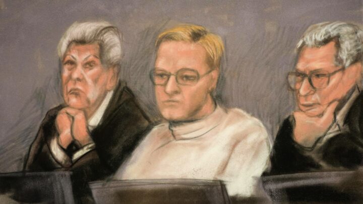 Wearing glasses, a brown sweater and beige trousers, he spoke quietly and conferred regularly with a defence lawyer.