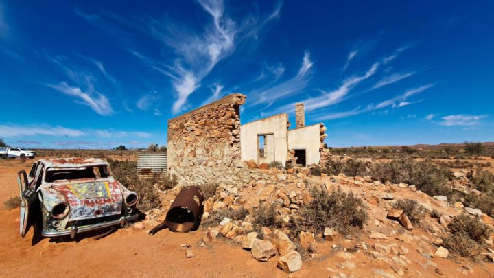 We travelled west-northwest, the contrast between almost barren rocky ground and the sky streaked with wispy cirrus was stark in the clear air. Of course, Milton was a font of other local knowledge. When we crested the semi-famous Mundi Mundi Lookout, where key Mad Max scenes were filmed, he wafted about how, below, once was an inland sea, 500 kilometres by 300 kilometres.