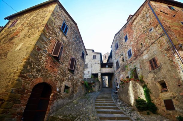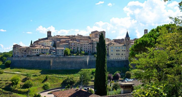 We first saw it when climbing over the tail of the Apennines on what’s touted as Europe’s straightest road, though there’s not a lot of opposition there. It’s listed as one of the ‘most beautiful villages in Italy’ though I wonder how the 13th century walls, renovated in the 15th and 16th centuries, rate on the scale of beauty. They’re still attractively intact, as is most of the town, though here and there you can clearly see the architecture has been moulded from more ancient brickworks.