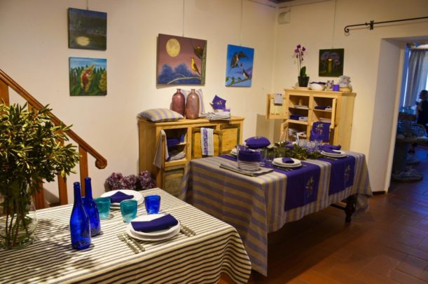 Anghiari — a hilltop town in the provence of Arezzo, Tuscany, Italy — is tricky to access. You park outside the town (as you do with most) but there’s a bus takes you somewhere further up. Just where we never find out because we stumble over Busatti, a place I’d targeted for Lorraine. Set in Palazzo Morgalanti, a grandiose name for an interesting building, it’s more than just a fabric shop, it has history running through its veins, including machinery more than a century old that is still used today though that is one storey down from the retail outlet that we first walk into.