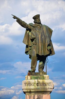 Time marched on and we marched down, buoyed by the fact that the town has thoughtfully put maps in key places so you know just where the heck you are and, when you’re tired, the quickest way out. It’s also probably the best as we glide down narrow alleys, go between a couple of museums in old palaces (so called) at Piazza Goffredo Mameli and head down through one of the two key entries to the town, Porta Nuova and Porta San Martino, which are side by side and lead to the Piazza Baldaccio where the weekly markets are held. It’s just outside the walls and a statue of Garibaldi stands in commanding pose over the piazza.