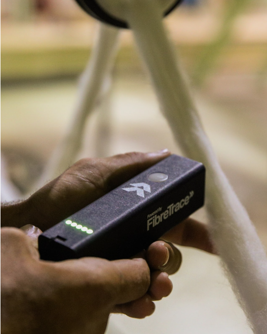 Traceability lets us verify what we say. At the gin, a tiny luminescent marker is bonded to the cotton. As the fibre moves through spinning, knitting, dyeing, and making, that marker is scanned and added to a secure digital record. Each scan logs time, place, and the independent auditor. By the time a garment reaches you, there is a clear story from farm to finish that we can check in real time.